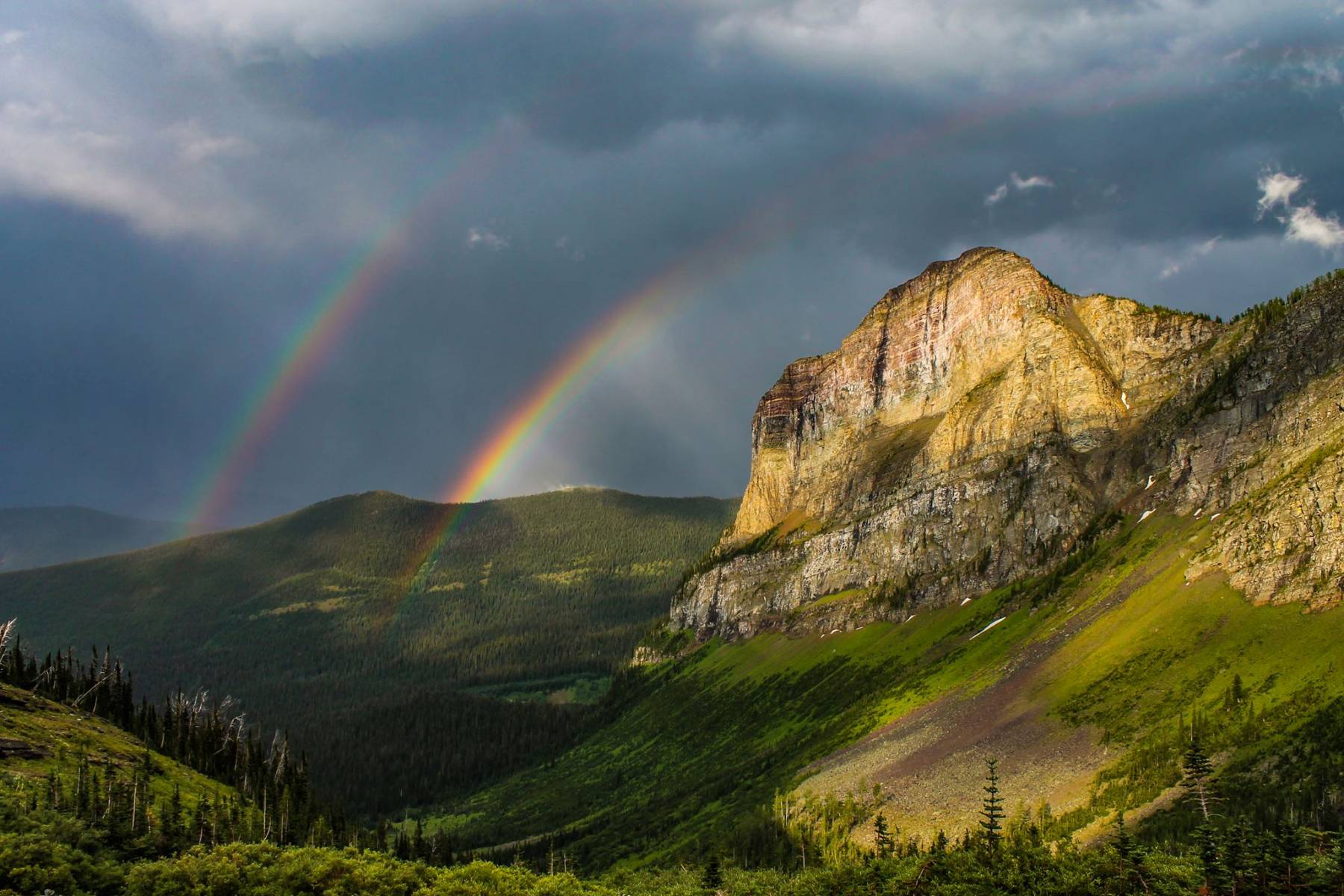 As we descend down from Grizzly Wide Pass into Grizzly Gulch, lightning once again steals the mid afternoon sky. Hail pounds our Gore-Tex and wind chills our bones. The storm clears. Rain lightly serenades the ground. The cumulonimbus cloud appears in the distance, two rainbows dance in the foreground amid lush glacier carved slopes and a sharp rock face. It was the perfect end to a perfect day in the “grizzly country” of the globally significant Flathead Valley.