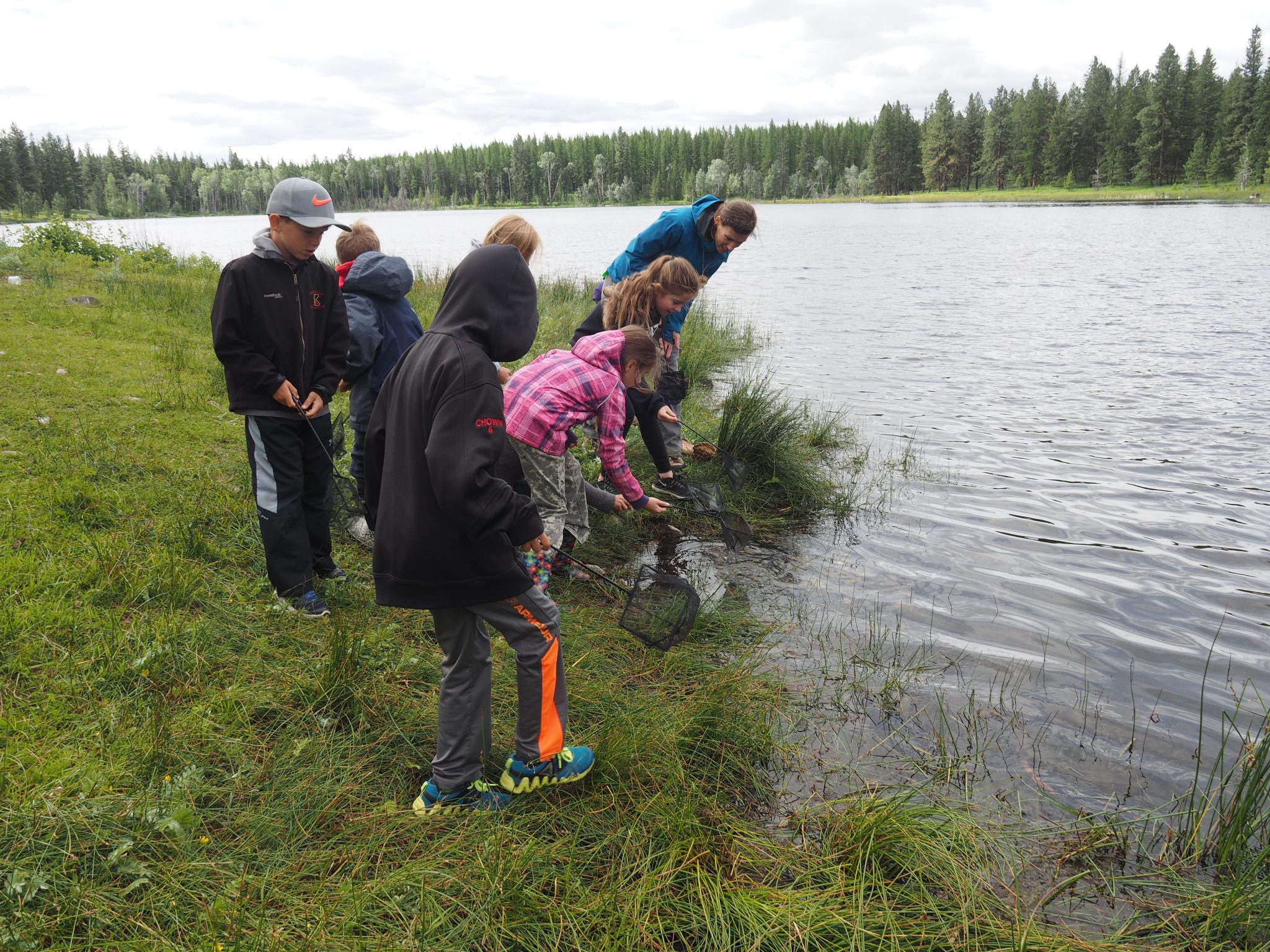 As the group exits the forest and steps into the clearing by the lake, their eyes fill with wonder, “So THIS is the lake!” someone exclaims. “Look at all the birds!” another student hollers, before running off to take a closer look. Today’s field trip is off to a good start. The sun is out, the mosquitoes are minimal, and we are greeted at the lake by a flight of swallows, swooping back and forth over the water. It’s quite a sight to be seen!