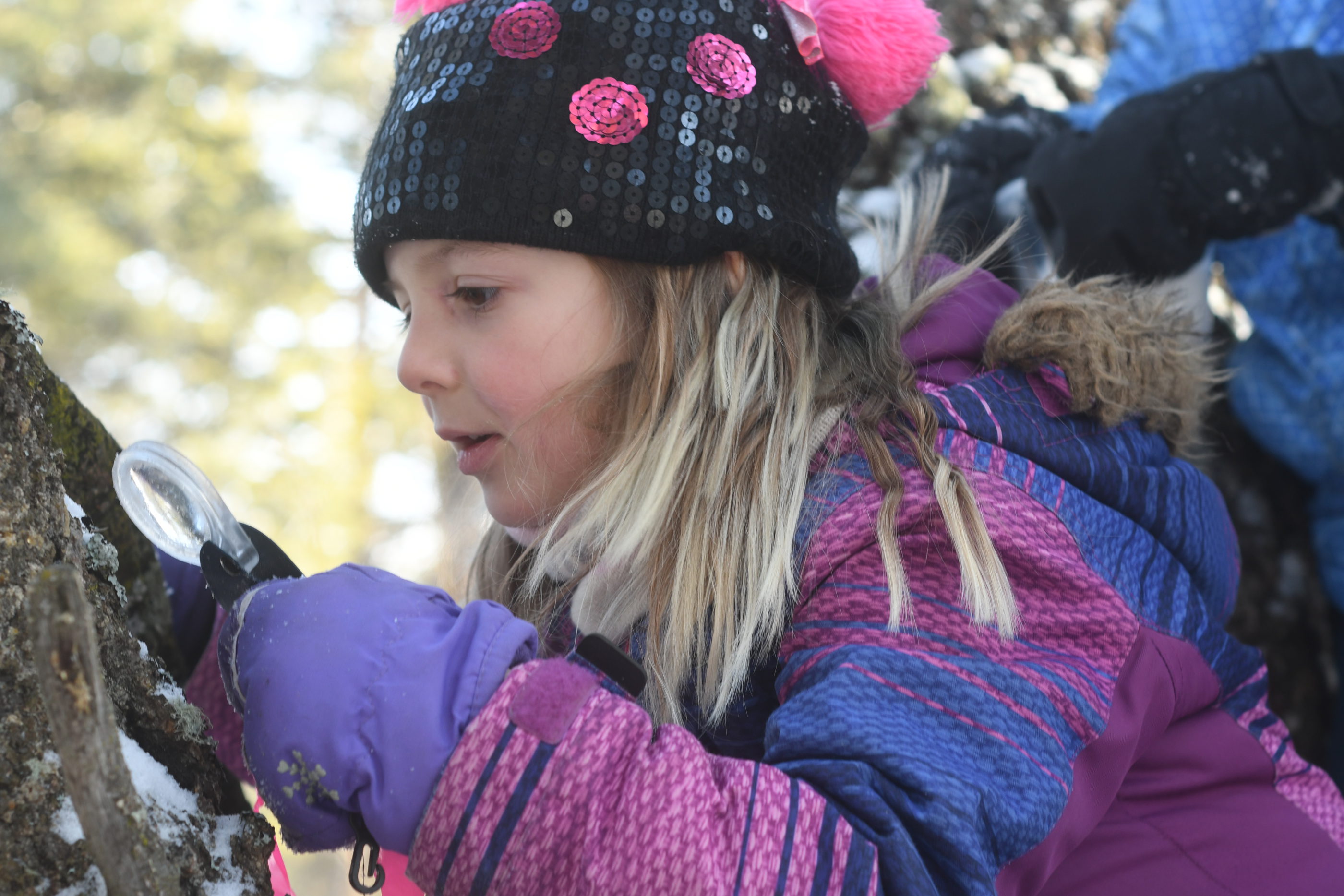 Students listen to the recorded sound of a chickadee heartbeat, and try to mimic its pace. They create mi¢̕qaqas ‘sundaes’, with a snowy ice cream base and toppings found throughout the forest, from tiny seeds and bits of needles to larger branches and even some berries. These small scientists clutch brightly-ribboned magnifying glasses in mittened hands to study their findings. They toss their sundaes in the air, giggling as the glittering mass falls.