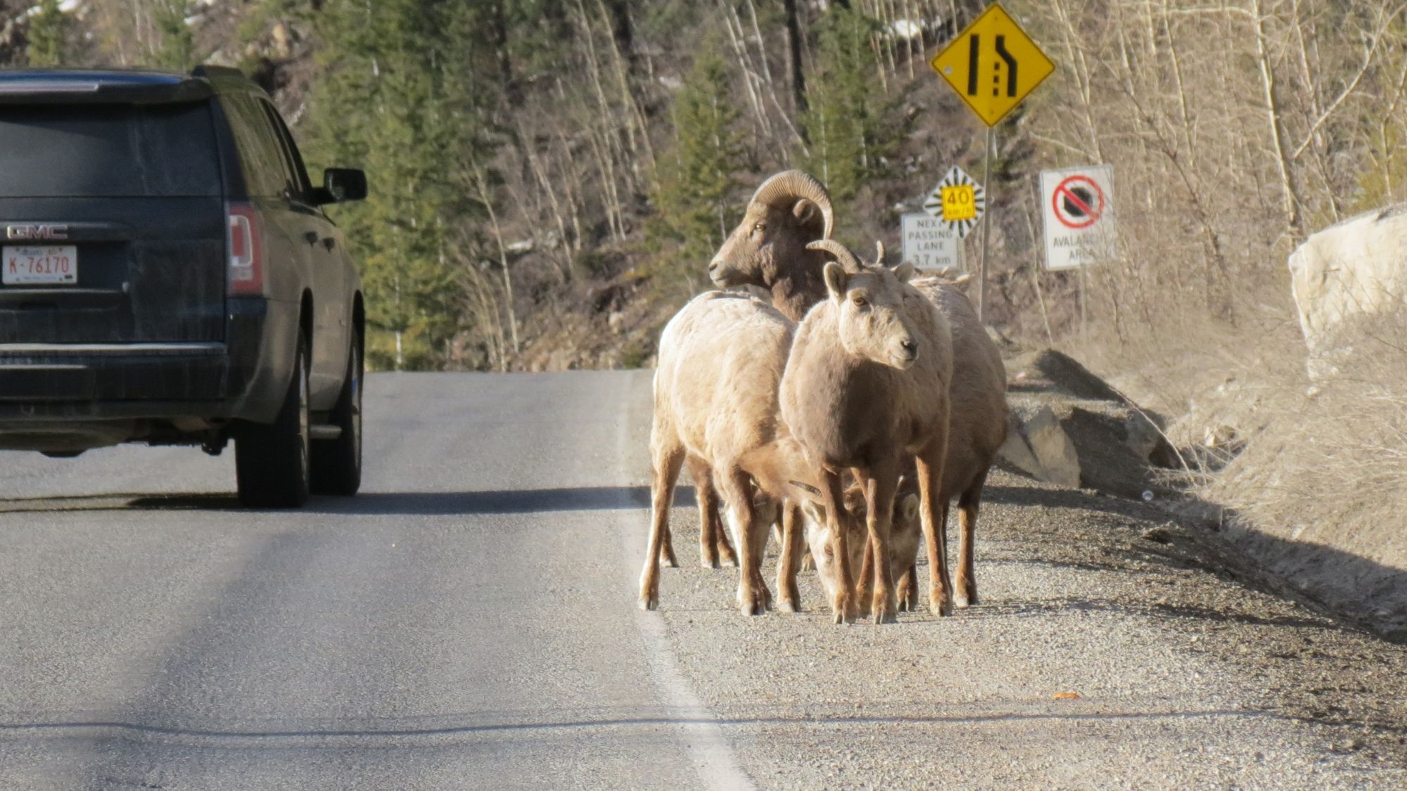 If you travel this corridor, you may be lucky enough to spot a Rocky Mountain bighorn sheep. A herd of about 14 sheep live in this narrow corridor and can be found roaming back and forth, drawn to the roadside for its vegetation, minerals, and perhaps easy passage and reprieve from some predators.