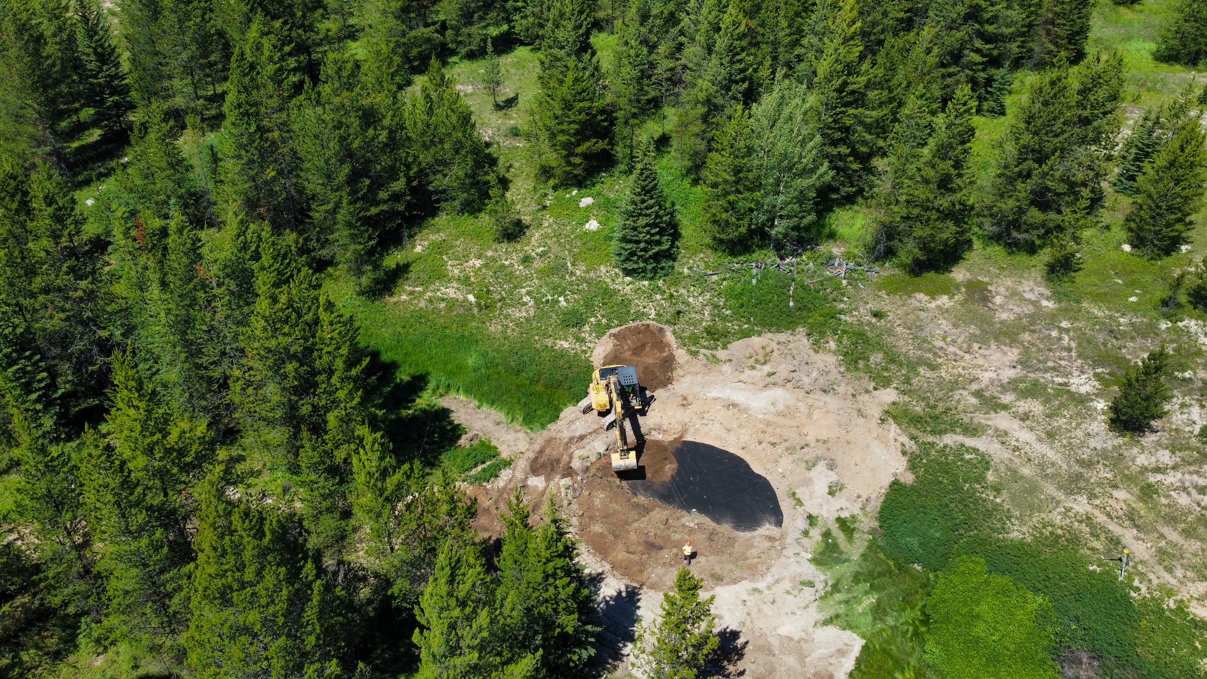 The Youth Climate Corps crew helped with the project, spending about a week on site this July. After an excavator dug out each basin, the YCC team helped with the finer detailing to make the basin wetland-ready. They pulled rocks and raked the surface smooth before lining the basin with a heavy-duty fabric (geotextile fabric) above, and below an aquatic-safe pond liner and a layer of soil. Another group came to sow seeds to help establish a vegetative layer to the basin. Woody debris was placed throughout the basins to add habitat as well.