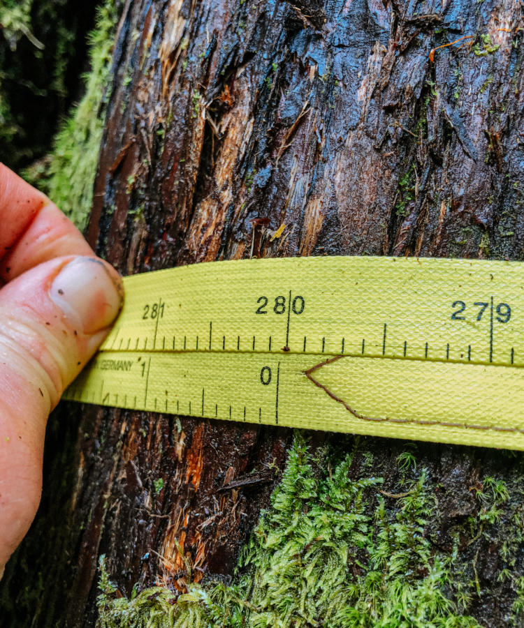 Measuring a large diameter cedar.