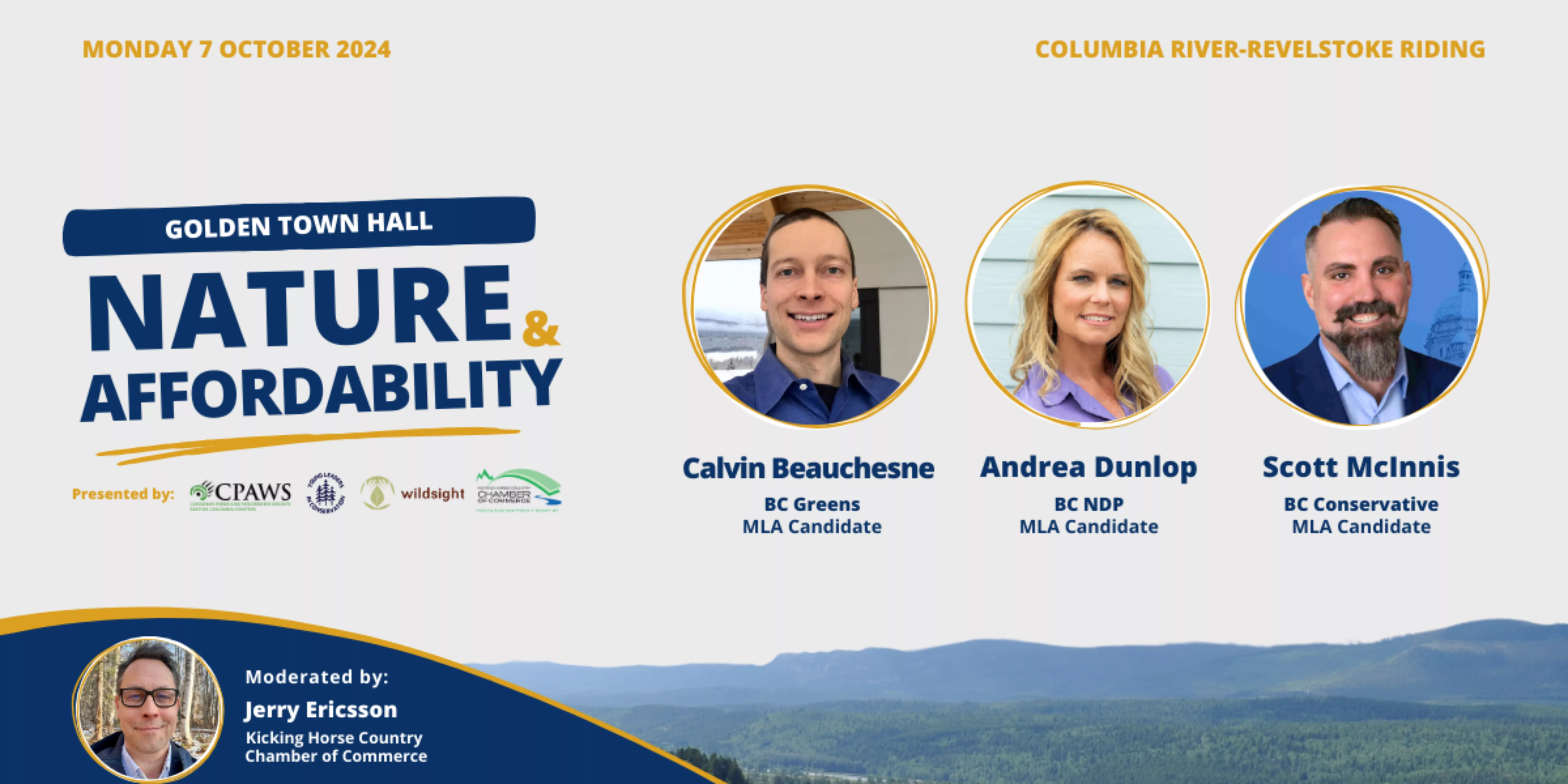 Voters in the Columbia River-Revelstoke constituency are invited to a town hall debate that will include a focus on nature and climate on the evening of Oct. 7, 2024 at the Golden Civic Center hosted by Canadian Parks and Wilderness Society, British Columbia (CPAWS-BC), Wildsight and the Kicking Horse Country Chamber of Commerce.