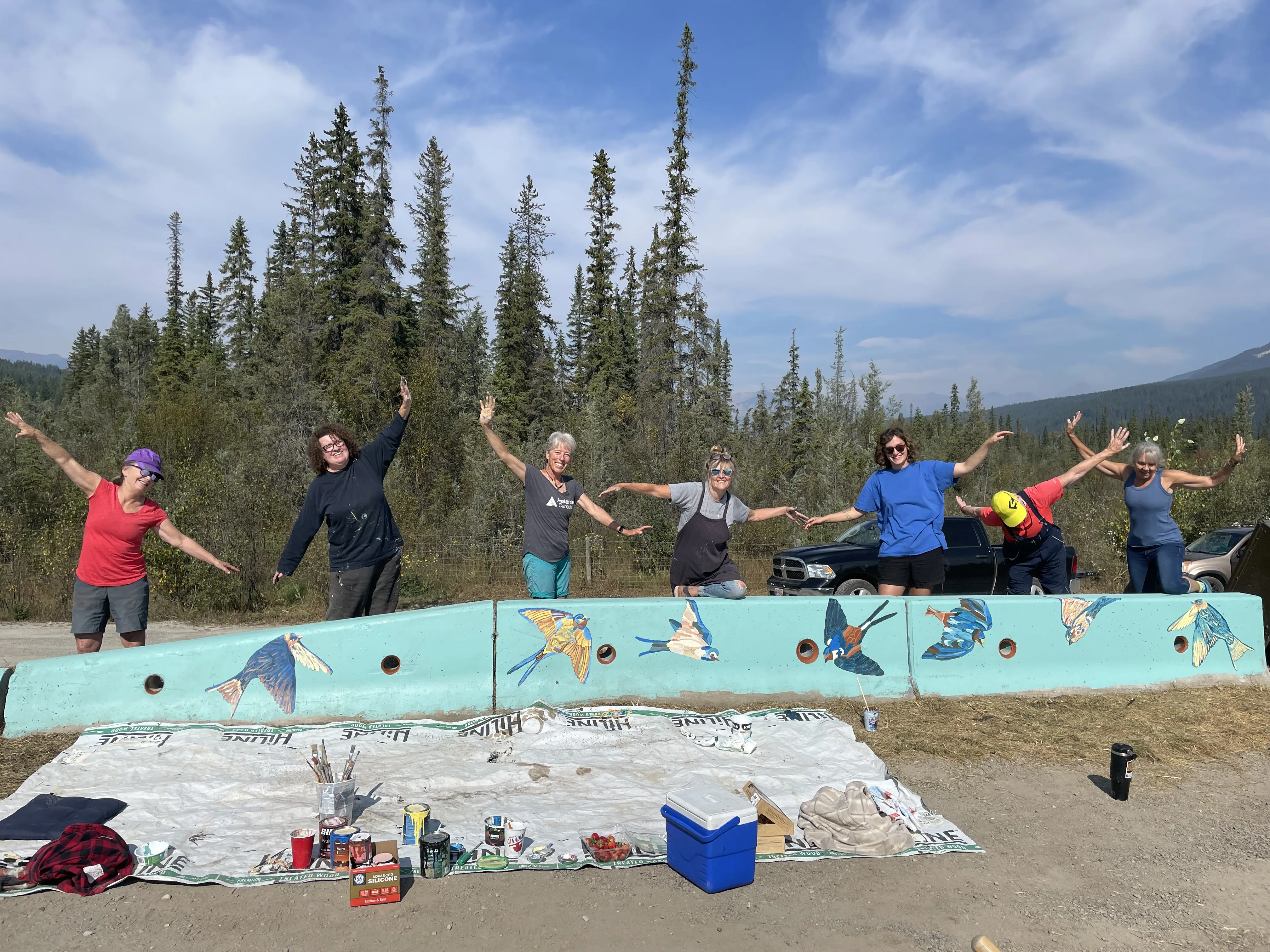 Wildsight Golden is thrilled to share the success of our latest community art project! Over a late September weekend, a team of enthusiastic volunteers gathered near the Dogtooth Bridge to paint beautiful swallow-themed murals on concrete barriers—adding a splash of colour and creativity to the roadside.