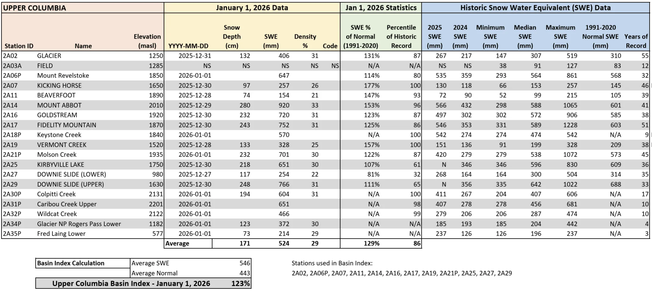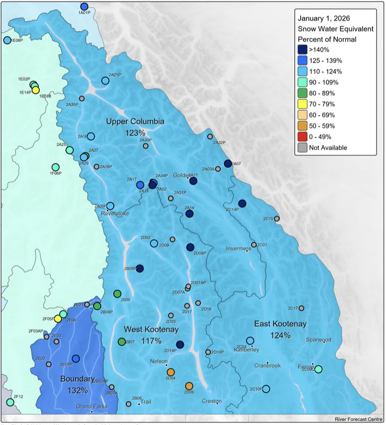 Each month from January through June, the B.C. Government releases snowpack data from 200+ monitoring stations across the province. According to the latest bulletin, it’s been a good winter for snow so far with almost all locations in the Kootenay-Columbia region above normal as of January 1.