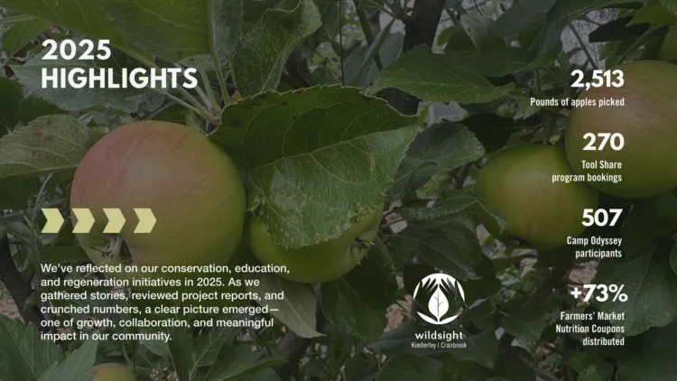 Last year gave us plenty to celebrate. Wildsight Kimberley Cranbrook ran 9 major programs in 2025: Apple Capture, Backyard Farmers, Camp Odyssey,  Forest & Nature School, Kimberley Community Garden, Kimberley Farmers’ Market, Marysville Eco Park, Meadowbrook Education, and Spooner Park. These programs are not only running smoothly and sustainably, but continuing to evolve and expand in good hands.