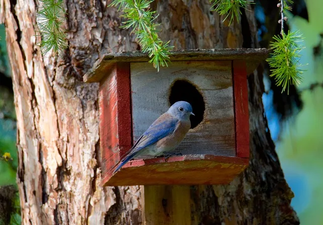 Mountain Bluebirds nest in natural cavities and woodpecker holes but also like nest boxes which can be seen on fence posts. Putting up a nest box is a great way to keep them on your property to watch them feed the nestlings!