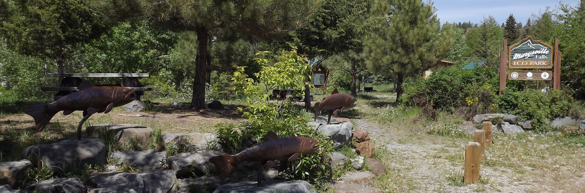 As part of greater recovery efforts on Mark Creek, Wildsight Kimberley Cranbrook established the Marysville Eco Park in 2004. Once a gravel parking lot serving the Marysville Falls, Wildsight partnered with the City of Kimberley to excavate and restore the streambank, and to establish native tree, shrub, and herbaceous plant species on the site. Local sculptor Tony Austin created trout sculptures for the Eco Park, and signage and picnic tables were installed to invite visitors to the space.
