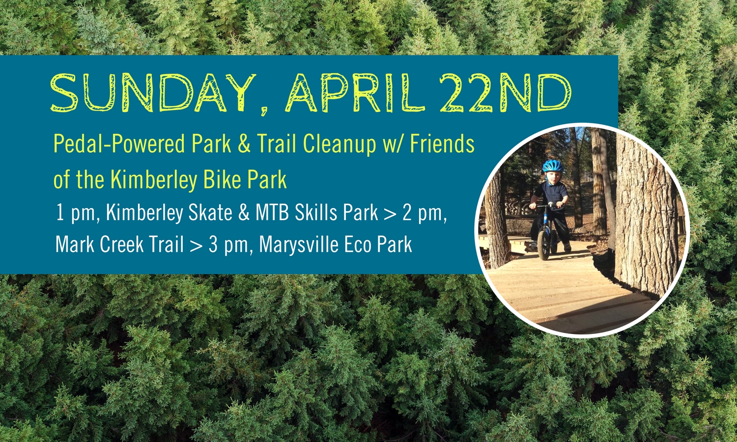 This Earth Day, join Wildsight Kimberley Cranbrook and the Friends of the Kimberley Bike Park in cleaning up our beloved parks and trails. Volunteers and their bicycles are invited to take part in any or every step of the journey, from the Kimberley Skate & Mountain Bike Skills Park, down the Mark Creek Trail to Wildsight’s Marysville Eco Park.