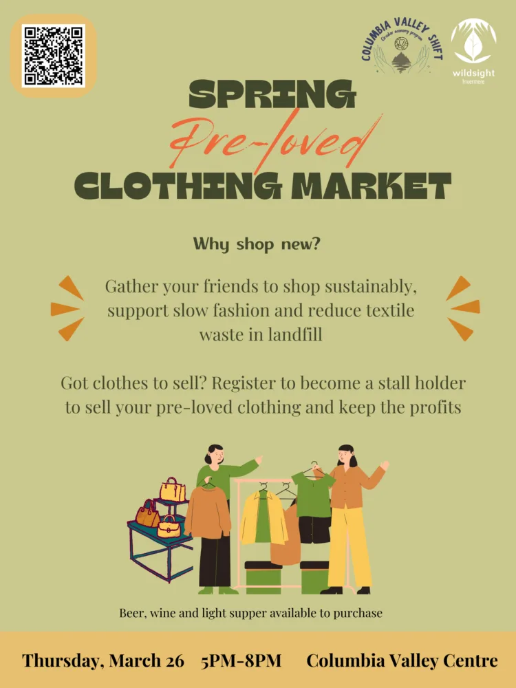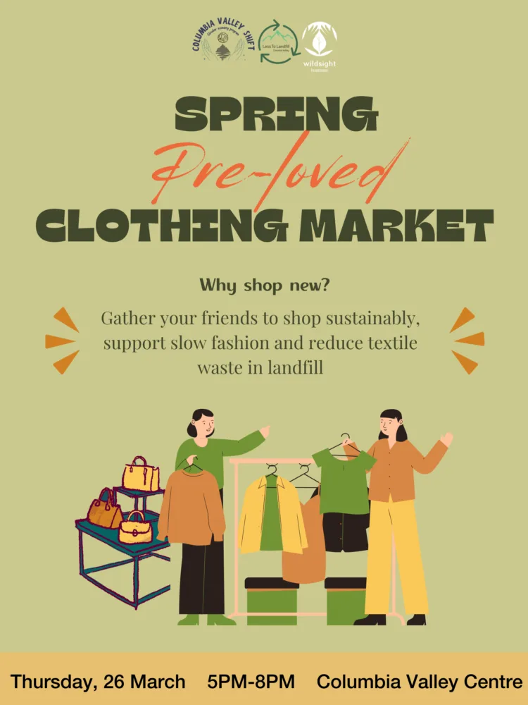 The Spring Pre-loved Clothing Market is a place to keep textiles out of landfill and keep good quality items in circulation in the Columbia Valley. Shop unique, affordable pre-loved fashion — good for your wardrobe, better for the planet. A space to connect to community, enjoy a variety of clothing, drinks, and good vibes.