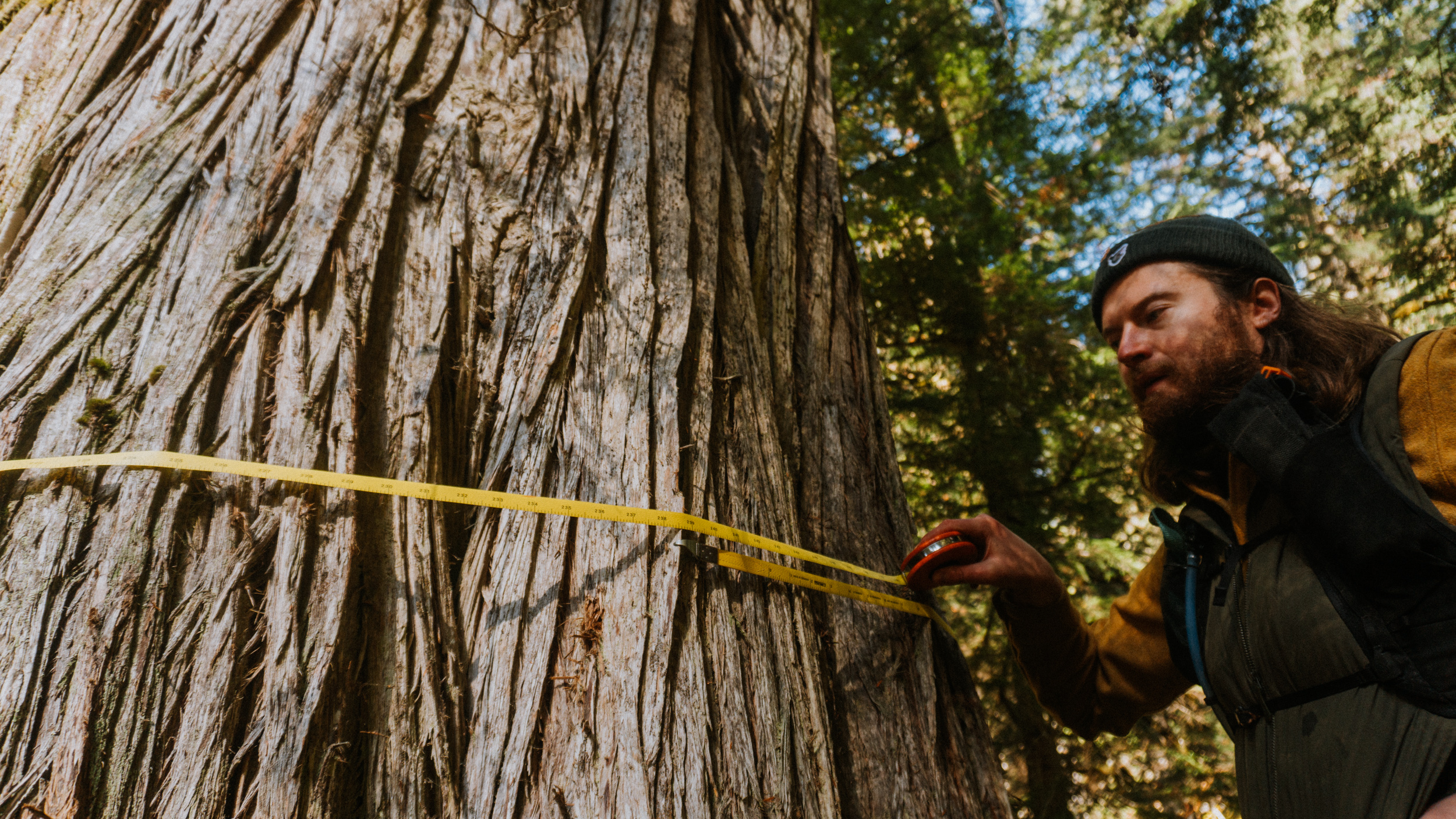- Caption: Wildsight Conservation Specialist Eddie Petryshen measures a western red cedar measuring over 2.3 meters in diameter, found inside a proposed cutblock in the Seymour River area, in B.C.’s Inland Temperate Rainforest. Photo by Bailey Repp / Wildsight